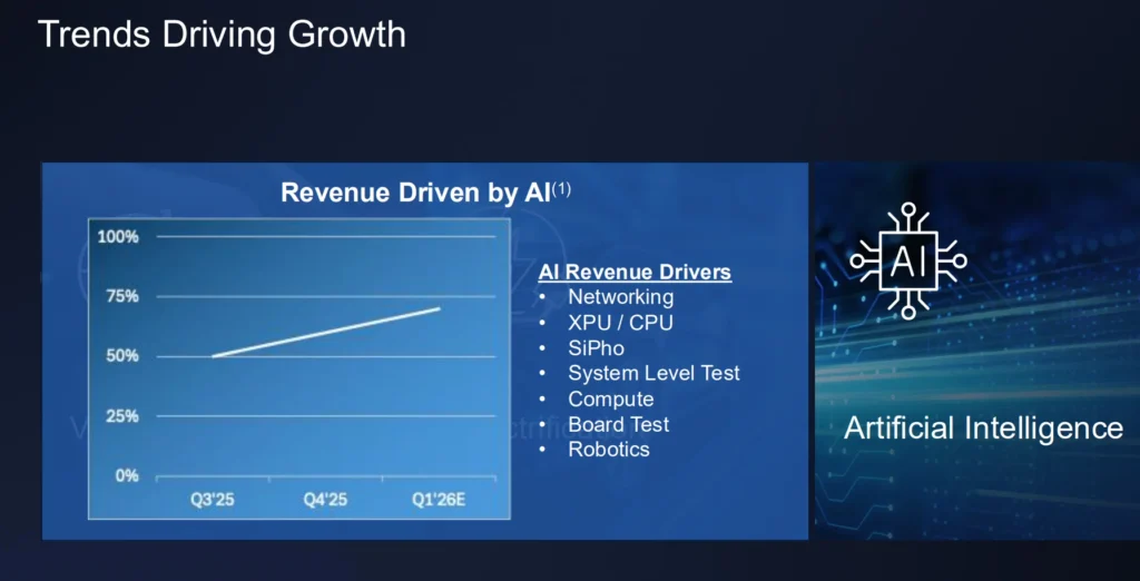 The company attributed its growth to AI-driven demand in the semiconductor testing business, particularly in computing, networking, and storage, and expects this demand to continue in the current year with growth across all business segments.